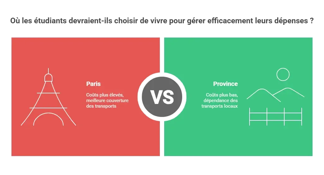 Autres coûts : le pouvoir d’achat diffère : les produits alimentaires et services sont en moyenne ~19 % plus chers à Paris qu’en province. Les loisirs (ciné, restaurants) sont plus chers en zone urbaine dense. À l’inverse, la vie en province peut offrir des dépenses moindres mais parfois de moins d’aides (ex. moins de CROUS, moins d’offres d’emploi étudiant).