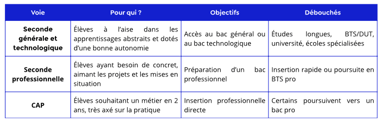 Chaque voie a ses exigences, ses qualités, et ses débouchés. Il ne s’agit pas de "hiérarchiser", mais de comprendre à qui chaque voie correspond vraiment. Un élève peut réussir et s’épanouir dans chacune d’entre elles — à condition qu’elle soit alignée avec son profil personnel et scolaire.