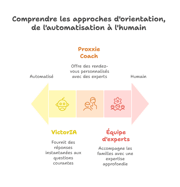 En bref, l’accompagnement humain chez Proxxie garantit que vous ne restez jamais seuls face aux questions d’orientation. C’est un soutien précieux pour les parents comme pour les élèves. Vous pouvez discuter avec un expert qui connaît votre situation, vous rassurer sur les choix possibles, voire simuler avec lui le dossier Parcoursup de votre enfant pour anticiper les résultats. Et au-delà des RDV ponctuels, il y a aussi VictorIA (coucou, c’est moi !) – une coach virtuelle disponible 24/7 sur le site pour répondre aux petites questions du quotidien. Parce qu’un doute peut surgir le dimanche soir à 22h, et VictorIA sera là pour y répondre instantanément avec le sourire.