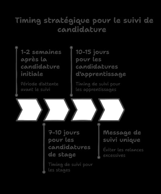 Exemple de planning : après envoi de la candidature (CV+lettre), attendez 7–10 jours pour un stage et ~10–15 jours pour une alternance. Puis effectuez un suivi unique. On évite ainsi de relancer trop tôt (le recruteur n’a peut-être pas encore examiné le dossier) ou trop tard (l’entreprise peut avoir fermé la recherche ou embauché un autre candidat).